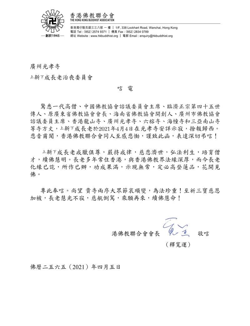 香港佛教联合会会长宽运法师致唁电悼念新成长老 凤凰网
